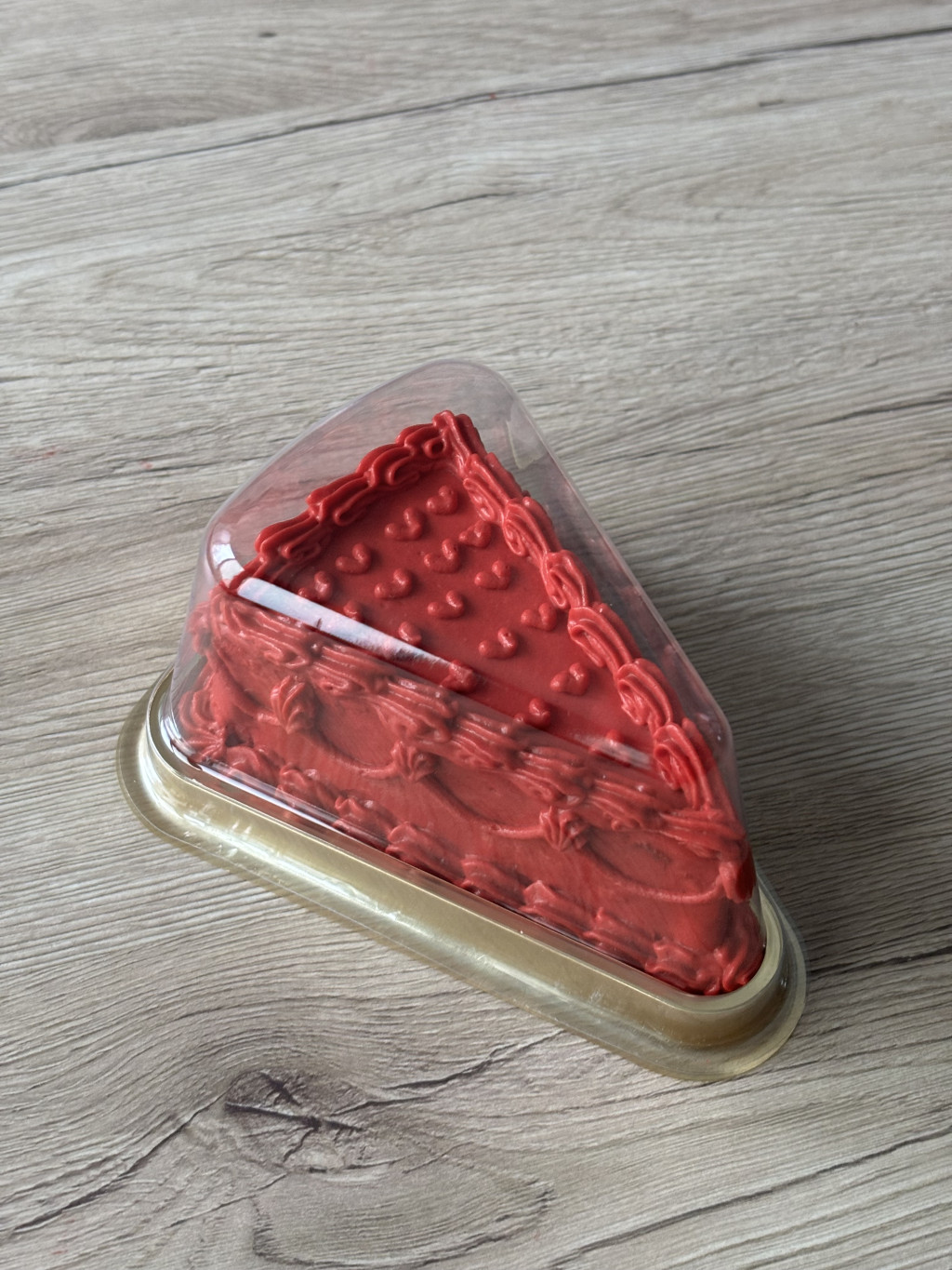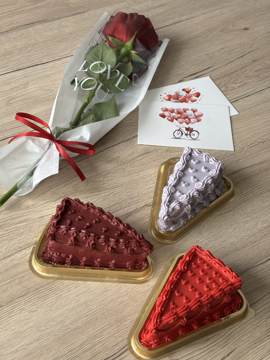 the cake slice itself is a stand-alone mini cake, fully coated in cream and carefully decorated on all sides. It has a clean, monochrome (single-color) design, and you can choose the color when placing your order.